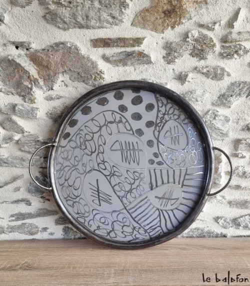 Plateau rond en métal recyclé coloré, fabriqué artisanalement par le collectif d'artistes burkinabé ZOODO ART basé actuellement au Sénégal. Une pièce unique issue de l’upcycling, idéale pour une décoration industrielle et responsable.