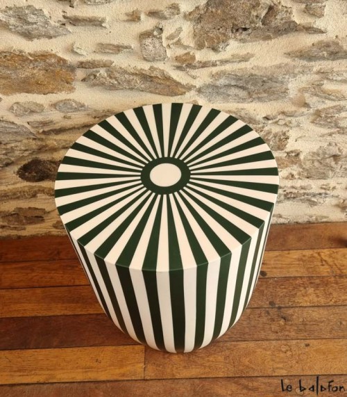 Ce tabouret Art Déco artisanal, ou table d'appoint, est entièrement fait main au Maroc à partir de lamelles de résine collées et cloutées une à une par des artisans passionnés.