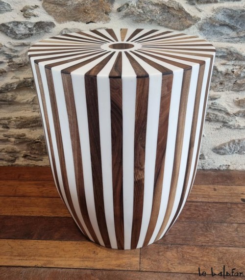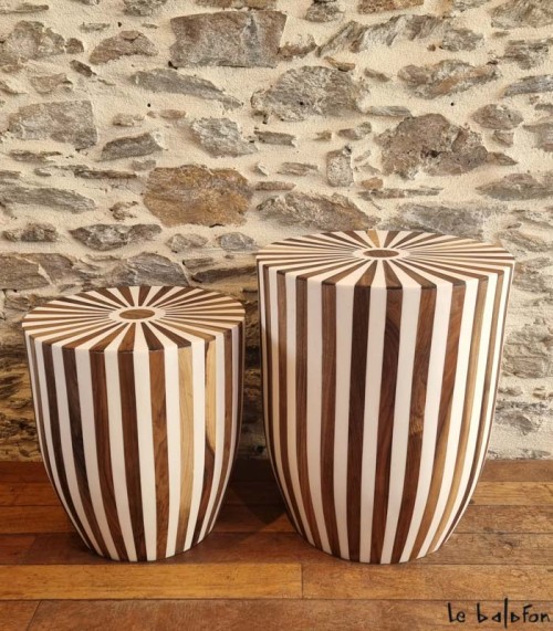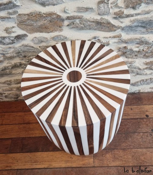Ce tabouret Art Déco artisanal, ou table d'appoint, est entièrement fait main au Maroc à partir de lamelles de résine collées et cloutées une à une par des artisans passionnés.
