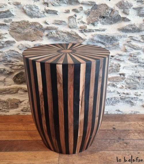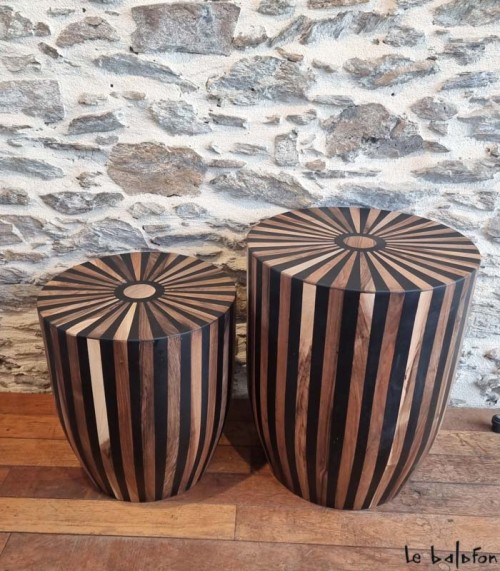 Ce tabouret Art Déco artisanal, ou table d'appoint, est entièrement fait main au Maroc à partir de lamelles de résine collées et cloutées une à une par des artisans passionnés.